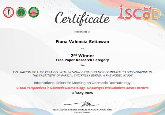 Fiona mempresentasikan hasil penelitian berjudul “Evaluation of Aloe Vera Gel With Vitamin E Combination Compared to Sulfadiazine in The Treatment of Partial Thickness Burns: A Rat Model Study”. Penelitian ini membandingkan efektivitas kombinasi bahan alami seperti gel lidah buaya dan vitamin E dengan terapi standar sulfadiazine dalam mempercepat penyembuhan luka bakar derajat parsial pada model tikus.